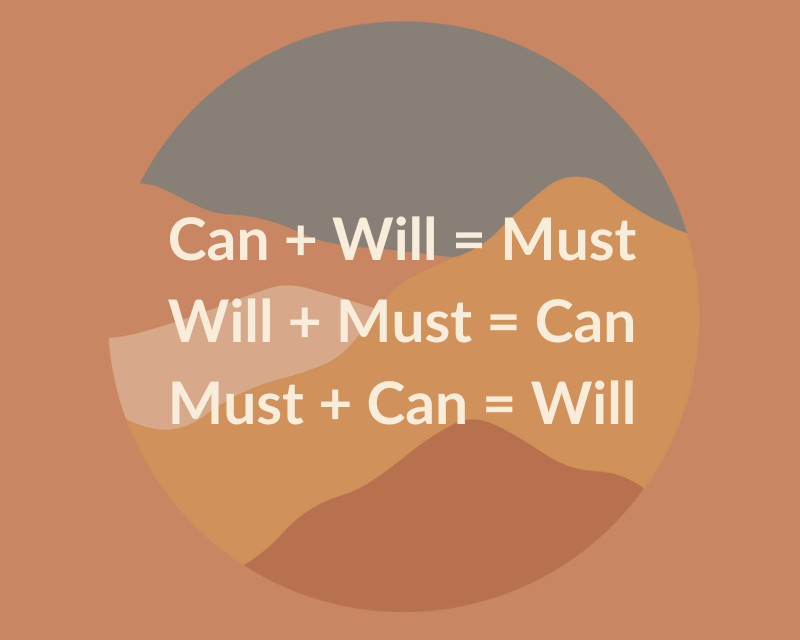 Must + Can = Will -> If you Must and Can, then you Will. This one is particularly useful when coming across uncomfortable or undesirable decision-making, because it reframes the situation from a “I don’t want to”, to “I have to and I can do it, so I will go do it”. You just took control back from a situation that previously could have felt like it dictated your situation and made it entirely your own. You will do it.