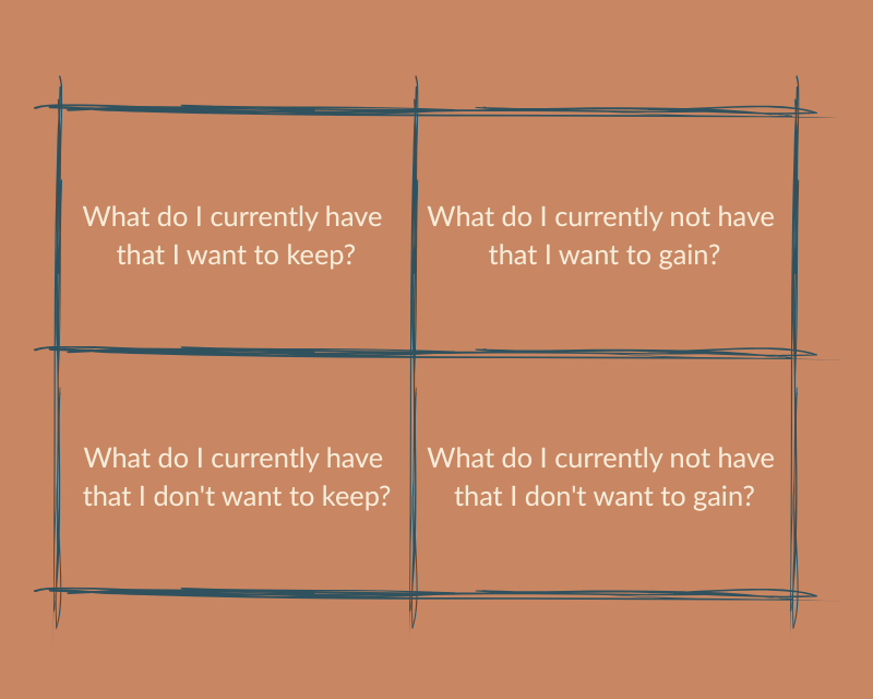 What can really make you think – and truly help you arrive at the right reasoning for your decision-making – are the bottom two questions. What do I currently have that I don’t want to keep? Meaning, what you have that you want / need to let go off, as they are currently not supporting your aspirations, ideas, ambitions, ideals, safety, comfort, and preservation. This can be an uncomfortable but very rewarding discovery. And it helps you shift your direction with determination and motivation.